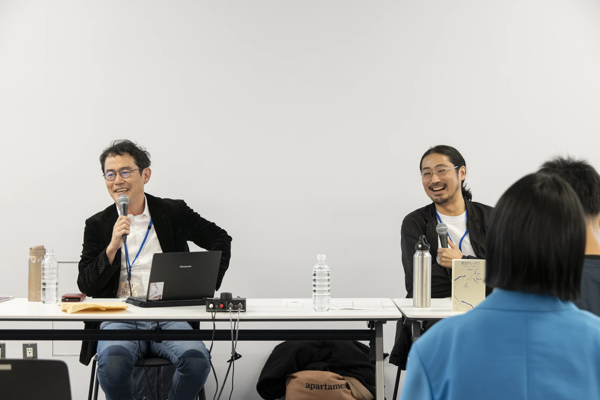 左から順に、登壇者の猪瀬浩平さん、水野祐さん