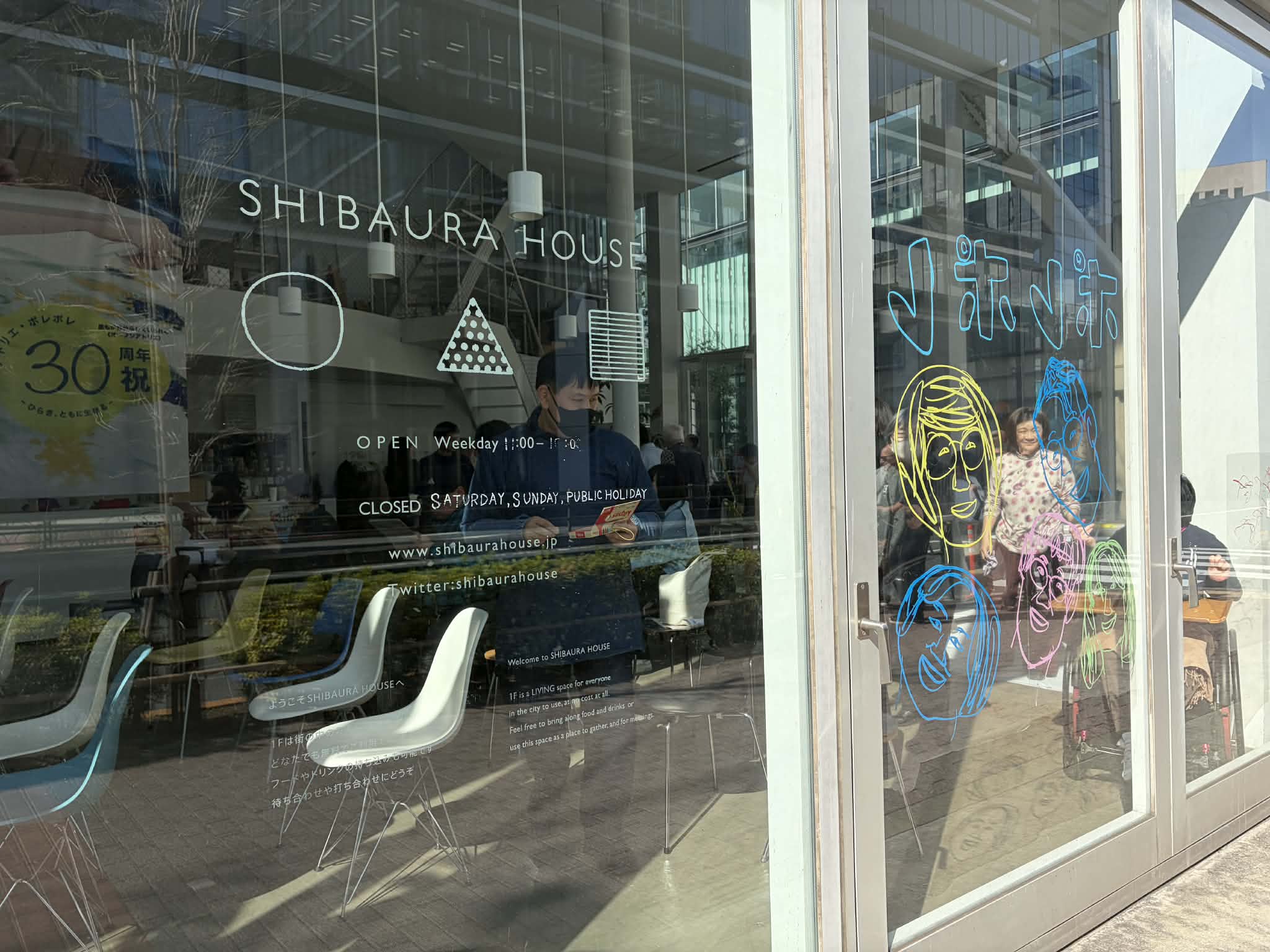 会場のSHIBAURA HOUSE 参加メンバーが“ガラスに描ける画材”を手に、思い思いの線や色を描いた