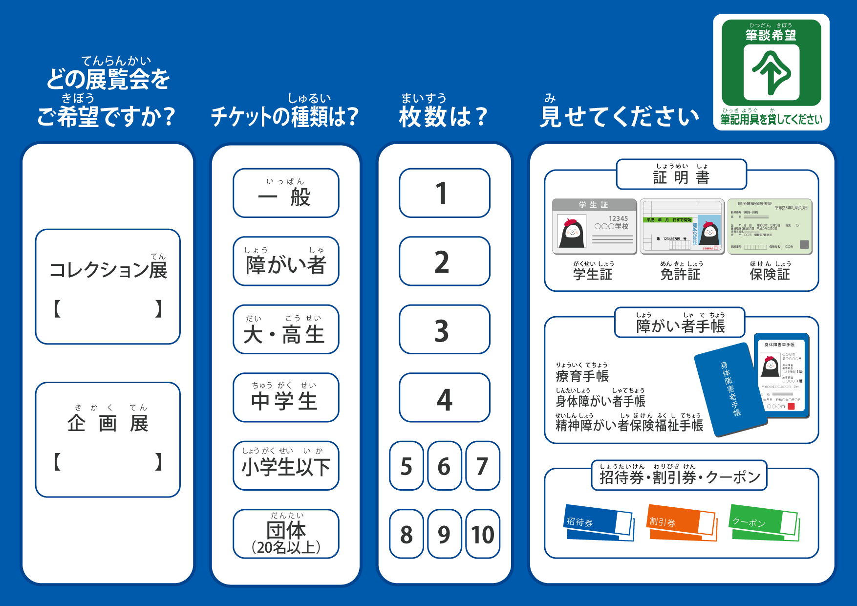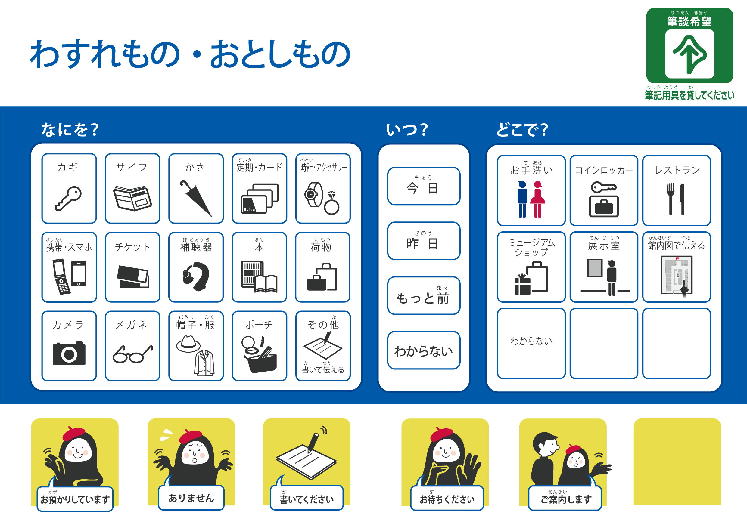 ●コミュニケーションボード (プログラム化済み) 美術館スタッフと聞こえない来館者とがスムーズにコミュニケーションするためのツール「コミュニケーションボード」を4種類作成しました。著作権フリーにしましたので、ダウンロードしてお使いいただいたり、必要に応じてデザインを修正してお使いいただくこともできます。また、すべての漢字にルビをふりましたので、知的障害のある方とのコミュニケーションボードにも使える可能性があります。さらに、多言語化することで日本語以外を母語とする人にも対応可能なボードにすることも考えられます。 デザイン:川田ゆか里 |