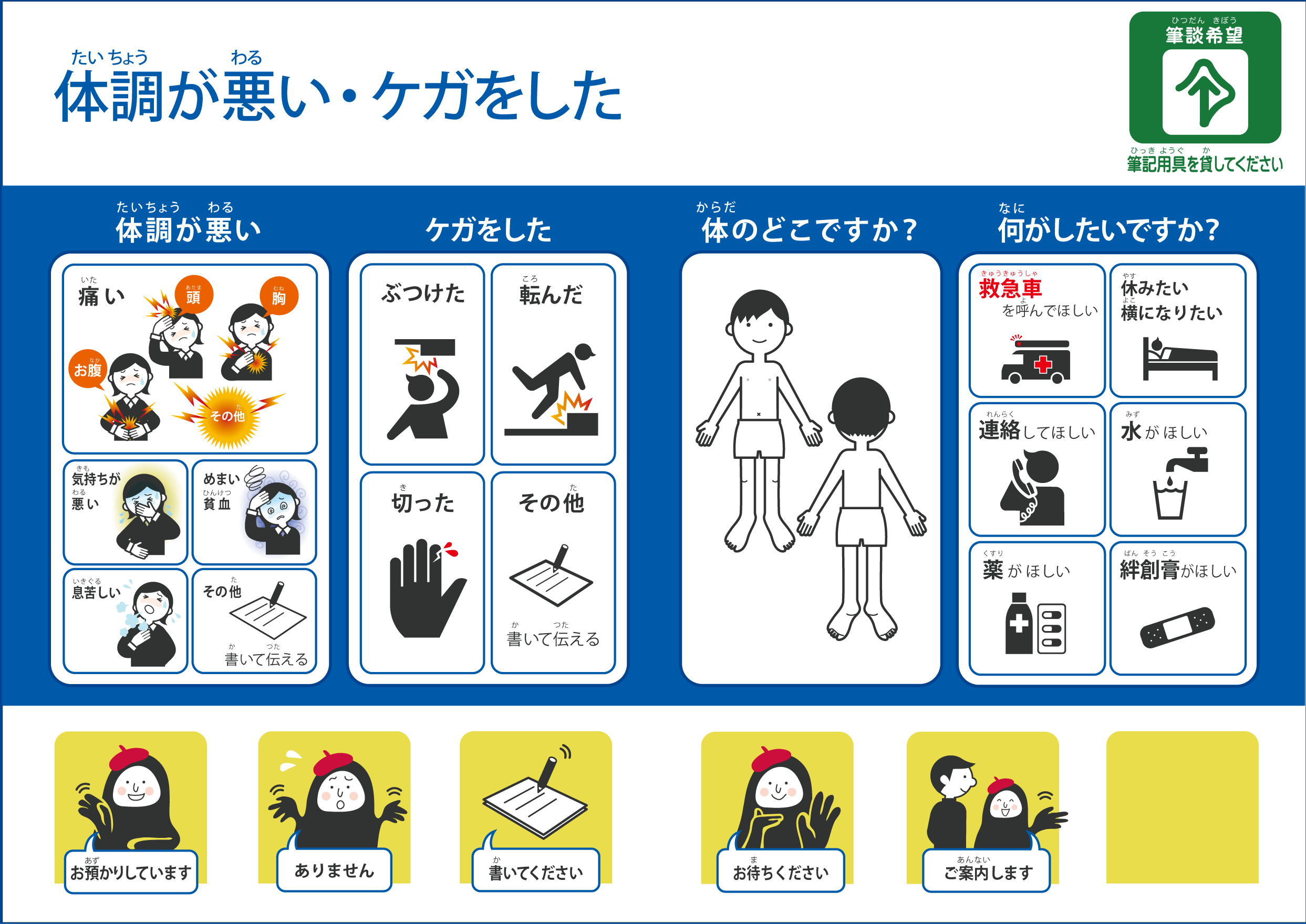 ・どこにありますか![]() →AI ファイル(非営利目的の利用・改変は自由) ・体調が悪い・ケガをした ![]() →AI ファイル(非営利目的の利用・改変は自由) |