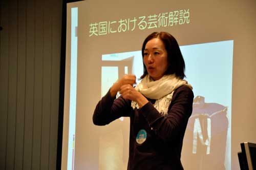 上記のふたつの取り組みについて広くみなさんにご報告し、各地の美術館において、聞こえない人が美術 鑑賞を楽しめる環境が整うことのきっかけづくりとして、プロジェクトの報告と鑑賞会を行ないました。 さらに、ロンドンで BSL(イギリス手話)による芸術解説員をしている南村千里さんを招きレクチャーをしていただきました。 |
