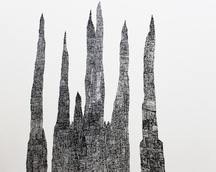 A/A galleryがこれまで共に活動してきた仲間たちが身近な道具で描いた作品は、色もタッチもさまざま。伸びやかな線、大胆な筆跡、綿密な線の集積。繰り返すリズム。