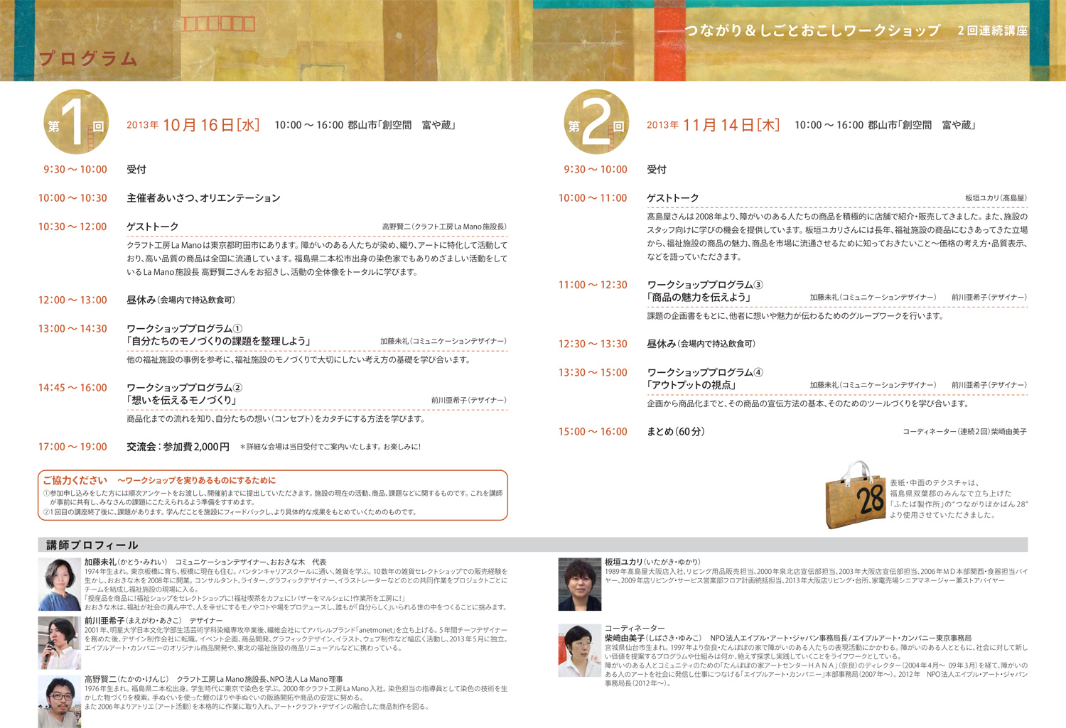 | 14:45-16:00 | ワークショッププログラム② 「想いを伝えるモノづくり」 前川亜希子(デザイナー) |