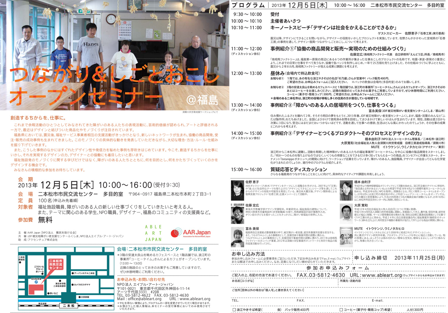 福島県においては、震災後、福祉サービス事業者相互の支援活動がきっかけとなり、新しいネットワークが生まれ、協働の商品開発、受注・販売の成功事例も生まれてきました。このモノづくりの具体的な動きを発表していただきながら、大切な理念・方法・ルール・仕組みを掘り下げていきます。