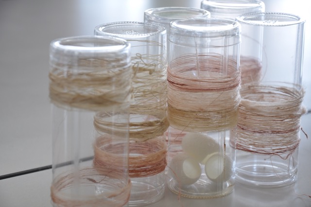 南三陸で収穫した繭を秋には背高泡立草、春には梅や桜などで染め、